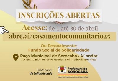 Os casais de Sorocaba interessados em oficializar a união no Casamento Comunitário já poderão se inscrever, a partir desta terça-feira (1), para participar da edição Casamento Comunitário 2025. Realizado pela Prefeitura de Sorocaba, por meio do Fundo Social de Solidariedade (FSS), a edição deste ano da cerimônia permitirá o matrimônio de até 300 casais. Um dos […]