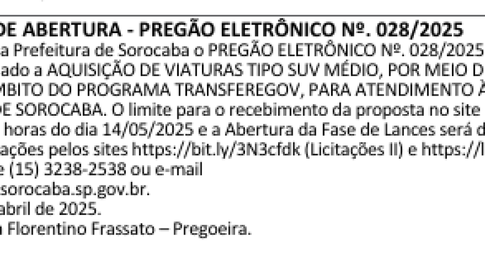 Por Redação ELTV+ Sorocaba Com o objetivo de reforçar o atendimento à população e ampliar a presença do poder público nas ruas, a Prefeitura de Sorocaba anunciou a abertura do Pregão Eletrônico nº 028/2025 para aquisição de viaturas tipo SUV médio. A ação faz parte de um convênio firmado no âmbito do Programa Transferegov, voltado […]