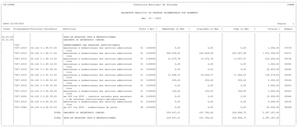 A Prefeitura de Sorocaba divulgou nesta semana o balancete analítico referente ao mês de março de 2025, apresentando um retrato detalhado das despesas orçamentárias por elemento. O documento, de caráter público e técnico, oferece um panorama importante da gestão financeira do município, destacando o volume empenhado, liquidado e efetivamente pago ao longo do mês. O […]