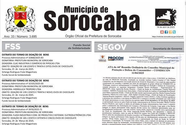 Principais destaques da edição nº 3.695 do Jornal do Município de Sorocaba, de 14 de abril de 2025