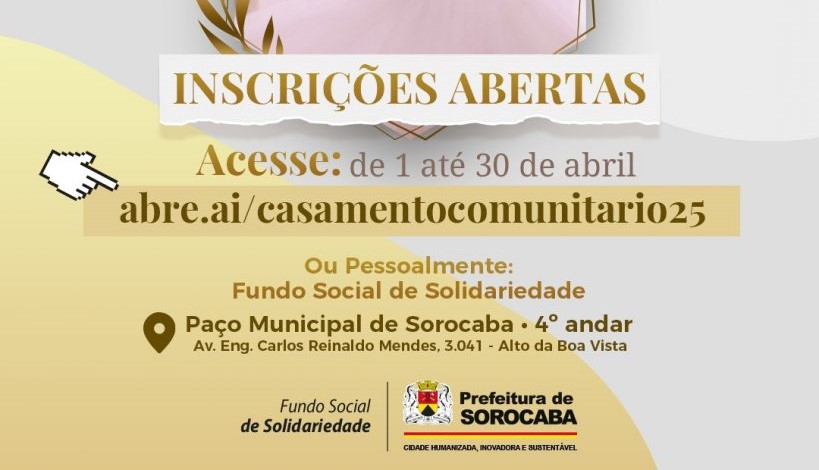 Os casais de Sorocaba interessados em oficializar a união no Casamento Comunitário já poderão se inscrever, a partir desta terça-feira (1), para participar da edição Casamento Comunitário 2025. Realizado pela Prefeitura de Sorocaba, por meio do Fundo Social de Solidariedade (FSS), a edição deste ano da cerimônia permitirá o matrimônio de até 300 casais. Um dos […]